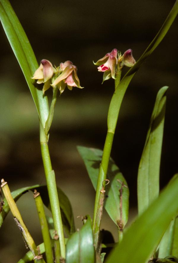 Found in Nigeria, Cameroon, Gabon, Zaire and Kenya in dry montane and secondary riverine forests at elevations around 390 to 1650 meters as a small sized, hot to cool growing epiphyte with narrowly cylindric, loosely clustered pseudobulbs enveloped by 3 to 4 sheaths and carrying a single, coriaceous, linear-lanceolate to oblong, obtuse to acute, articulated below into the cuneate base leaf that blooms at most any time of the year on a terminal, erect, peduncle stout, pubescent, shorter than the leaf, 2.2 to 6" [5.5 to 15 cm] long, simple to rarely branched, rachis densely pubescent, laxly to 20 flowered inflorescence.