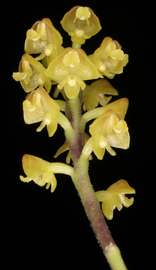 Found in Ghana, Ivory Coast, Liberia, Mali, Nigeria, Togo, Central African Republic, Cameroon, Gabon, Gulf of Guinea Islands, Zaire, Ethiopia, Kenya, Tanzania, Uganda, Angola, Mozambique, Zambia and Zimbabwe in lowland evergreen and riverine forests at elevations of 200 to 1800 meters as a miniature sized, hot to cool growing, high level epiphyte or occasional lithophyte with narrowly conical to cylindrical, curved, close set pseudobulbs carrying 2 to 4, fleshy, narrowly strap-shaped, conduplicate, unequally and obtusely bilobed apically leaves that blooms in the summer on a terminal, to 16" [40 cm] long, shortly branched, many flowered inflorescence enveloped basally by papery sheaths and carrying rather fleshy, sparsely pubescent flowers.