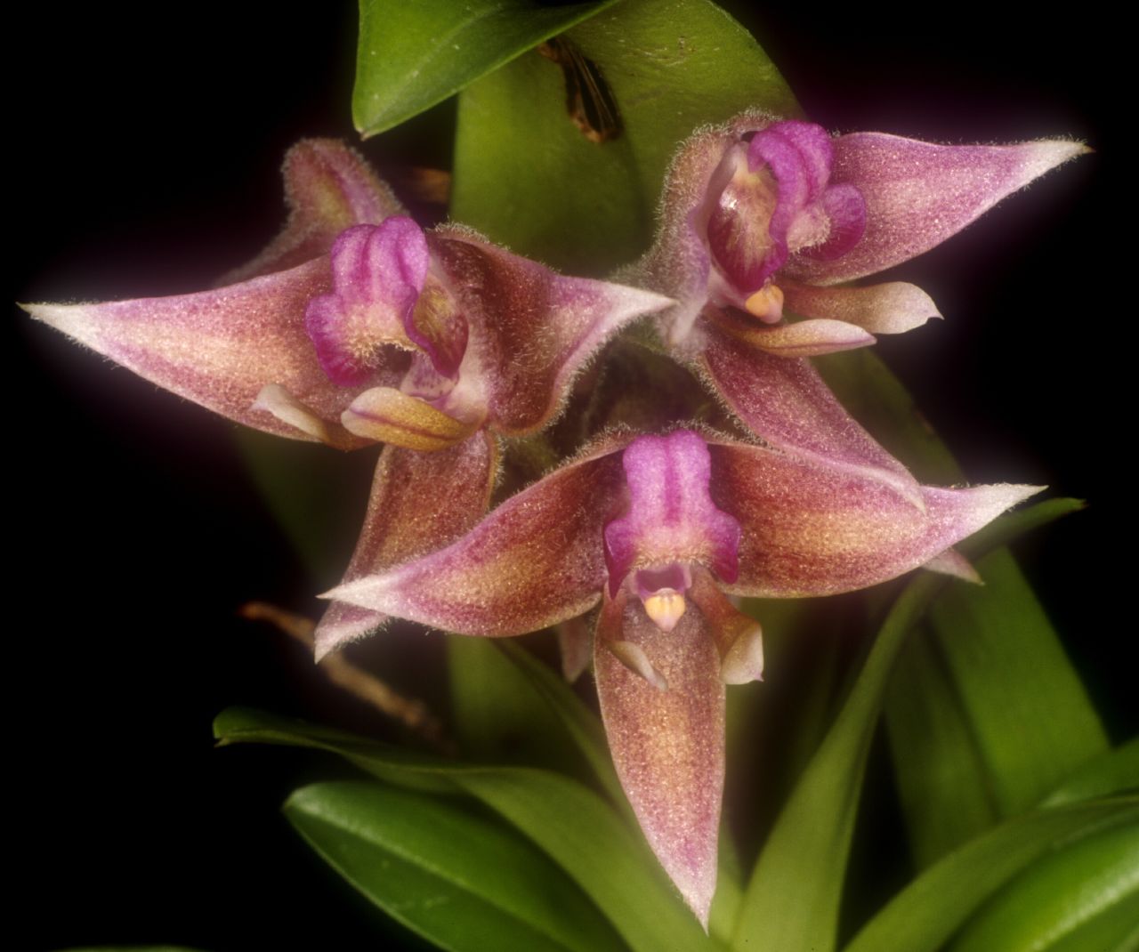 Found in Malawi on open, rocky hillsides and mountaintops at elevations of 1600 to 2000 meters as a small sized, cool growing epiphyte on Xerophyta with ovoid, oblong, or almost round yet slightly bilaterally flattened pseudobulbs in dense clumps carrying three, lanceolate, dark glossy green, tinged with dark purple, deciduous leaves that blooms in the fall and spring on a 2" [5 cm] long, few to several [2 to 10] flowered inflorescence arising on new pseudobulbs as the leaves develop.