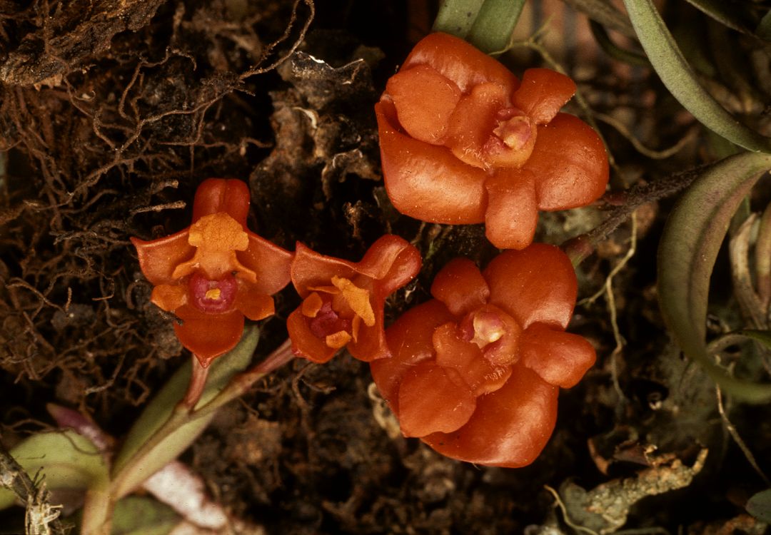 Found in Rwanda, Zaire and Uganda in lichens and mosses in forests with mountain gorillas at elevations of 2000 to 3200 meters as a mini-miniature sized, cold growing epiphyte with slender, cylindrical pseudobulbs that arise from the middle of the previous growth and carrying 2 to 5, linear, acute, leaves and blooms at most any time ofd the year on a 1/2 to 1" [1.25 to 2.5 cm] long, shorter than the leaves, 1 to 3 flowered inflorescence with wide open, fleshy flowers.