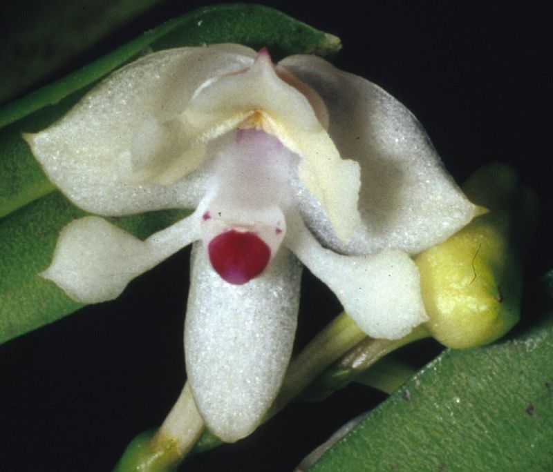 Found in Kenya and Northern Tanzania in montane and submontane forests at elevations of 1500 to 2300 meters as a miniature sized [6"], warm to cool growing epiphyte with fatter, cylindrical, clumping pseudobulbs carrying a single, apical, flat strap-shaped leaf that blooms on a shorter than the leaf, 3" [7.5 cm] long, racemose, several [6] flowered inflorescence.