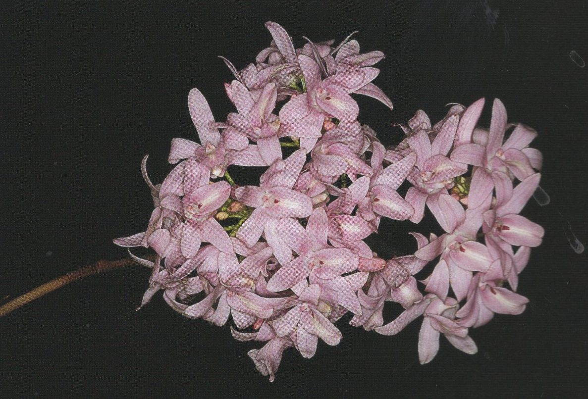 Found in Tanzania as a medium to large sized, cool growing lithophyte on mountain slopes at elevations of 1100 to 1600 meters with conical, clustered pseudobulbs carrying 4 to 8, linear, acute, sometimes purple blotched, deciduous leaves that blooms in the spring on a terminal, 3 foot [90 cm] long, branched, several flowered inflorescence with overlapping sheaths. Give this species a bark or terrestrial mix, bright light and a dry winter rest after the leaves fall.