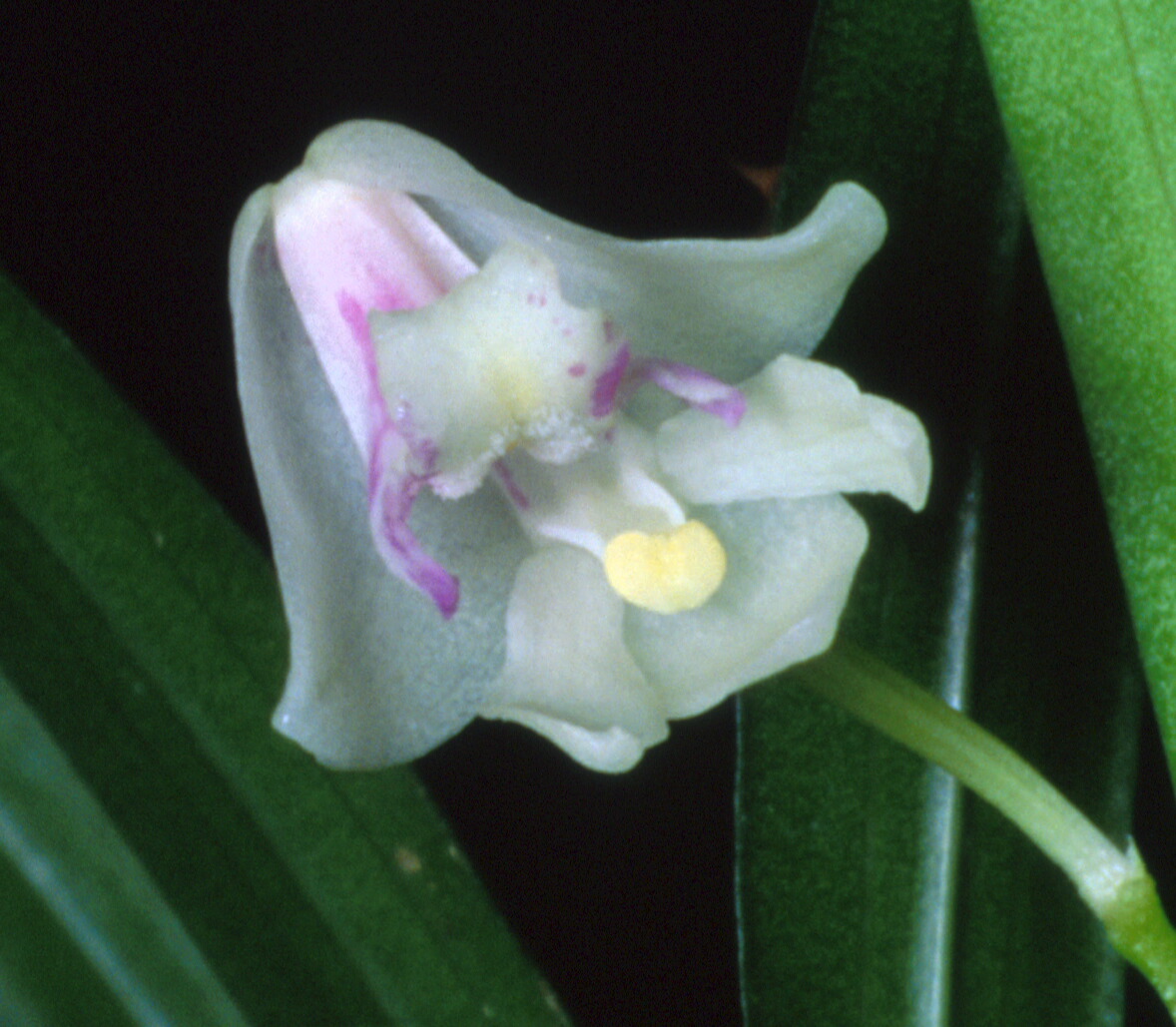 Found in Burundi, Rwanda, Zaire and Uganda in upper montane forests at elevations of 2500 to 3500 meters as a miniature to small sized, cold growing epiphyte with clustered, narrowly cylindric pseudobulbs enveloped basally by 2 to 3 membraneous sheaths and carrying a single, coriaceous, linear, subacute to obtuse, cuneate below leaf that blooms in the summer on a slender, racemose, .35 to 1.6" [.8 to 4 cm] long, to 4 flowered inflorescence that is shorter than the leaf and has a membraneous, basal bract and ovate-triangular, amplexicaul, acuminate bracts