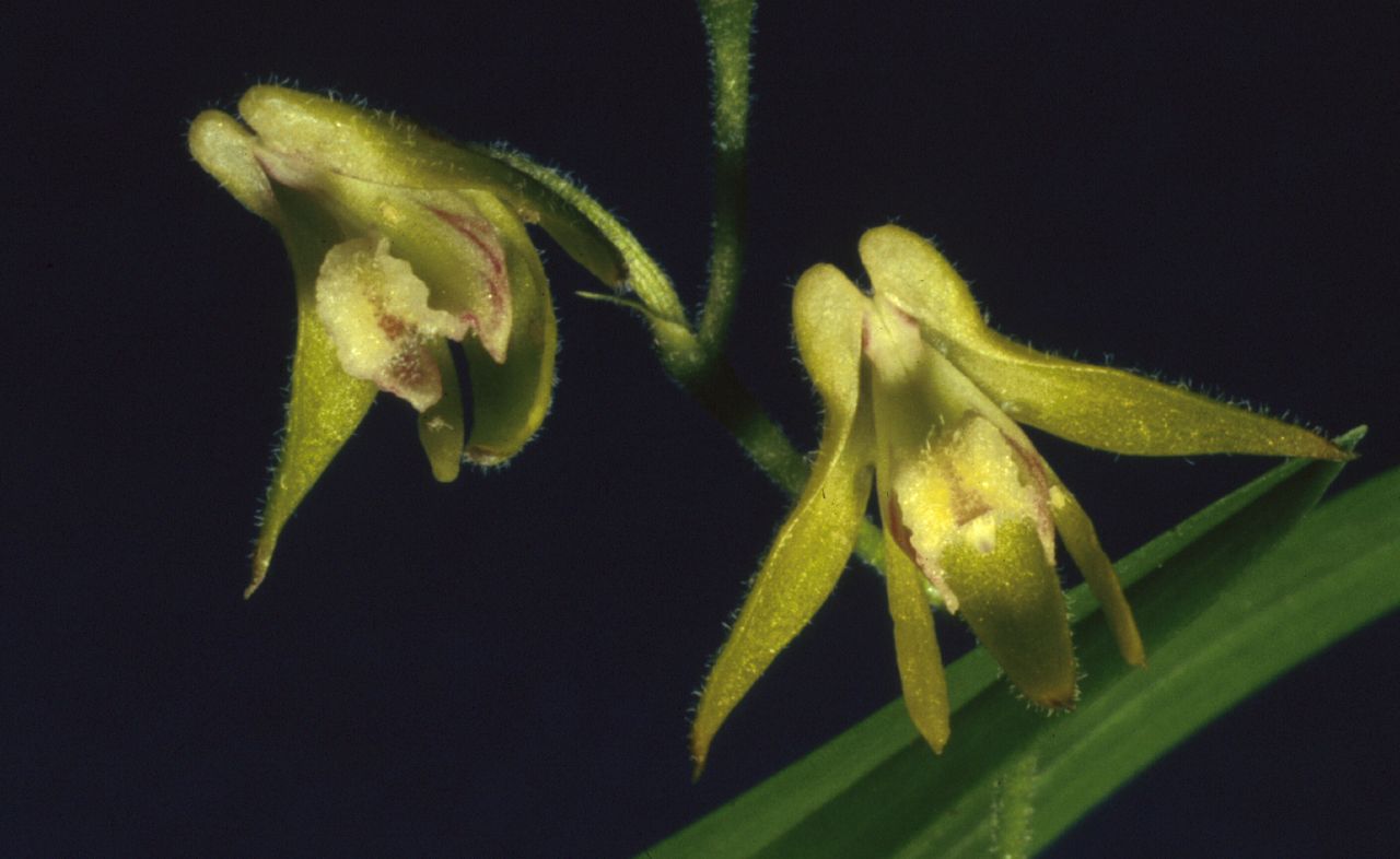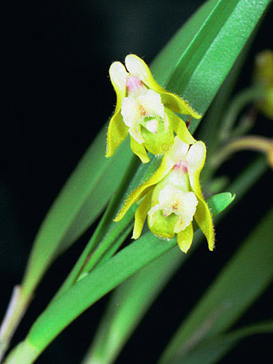 Found in southern Malawi within 50 km of Blantyre on trunks and main branches of trees in rainforests at elevations of 800 to 1400 meters as a small to medium sized, warm to cool growing epiphyte and occaisional lithophyte with green, ovoid, chain-forming pseudobulbs carrying 2 to 3 linear, grasslike,deciduous leaves that are fully mature at blooming which occurs on a 4 to 5 3/4" [10 to 14cm]long, to 10 flowered inflorescence with spicely scented, pubescent flowers.