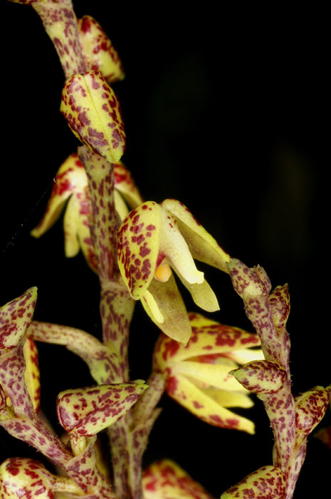 Found in Zaire, Rwanda and Kenya at elevations around 1800 to 2300 meters as a mini-miniature to small sized, cool growing epiphyte with clustered, narrowly cylindrical, dark green pseudobulbs carrying a single, elliptic to ovate, obtuse, basally auriculate leaf that blooms in the later summer on a terminal, sparsely hairy, branched, 1.6 to 6" [4 to 15 cm] long, successively several to 60 flowered inflorescence with inconspicuous bracts.
