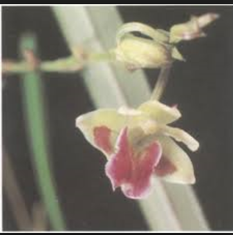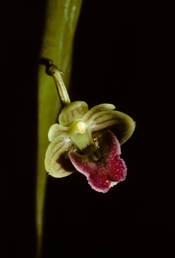 Found in Burundi, Rwanda, Zaire and Uganda in deep montane forests at elevations of 1800 to 2900 as a medium sized, cool to cold greowing epiphyte meters with a tufted, thin, green, densely purple spotted stem carrying a single, strap shaped, to 4.8" [12 cm] long, very tough, hard, rounded apically leaf that blooms in the later summer on a terminal, erect, slender, paniculate, 1 to 6 branched, to 7.6" 19 cm] long, , arching to pendulous, many flowered inflorescence with triangular-ovate, apiculate, amplexicaul floral bracts and carrying successively opening flowers.