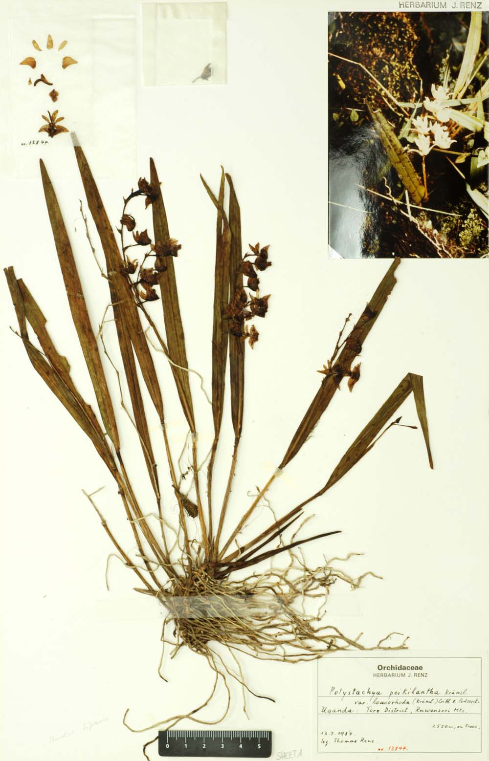 Synonyms Polystachya leucorhoda Kraenzl. 1909; Polystachya poikilantha var. leucorhoda (Kraenzl.) P.J.Cribb & Podz 1979;