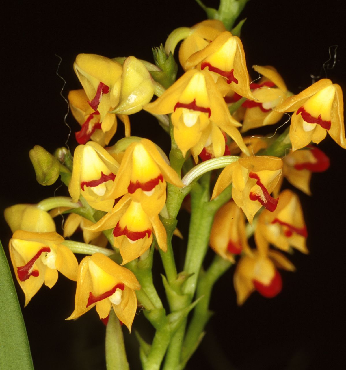 Found in Madagascar in lichen forests at elevations of 1400 to 2000 meters as a medium sized, cool growing terestrial or occasional epiphyte with cauliform pseudobulbs carrying 3 to 4 linear-lingulate, slightly attenuate basally leaves that blooms in the spring and summer on a 8" [20 cm] long, branched inflorescence with 2 ancipitous, wide sheaths and narrowly lanceolate floral bracts that are longer than the flowers.