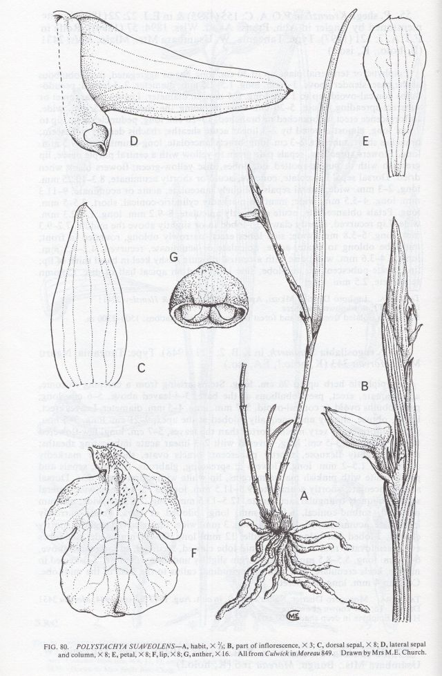 Polystachya suaveolens P.J.Cribb 1978 SECTION Isochiloides Drawing by © M E Church/Cribb