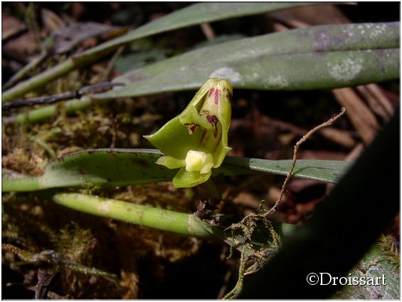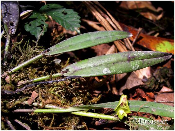 Found in Nigeria, Gabon and Cameroon in submontane forests at elevations up to 1250 meters as a mini-miniature sized, hot to cool growing epiphyte with narrowly cylindrical, slender, delicate pseudobulbs enveloped by 1 to 2 basal sheaths and carrying a single, apical, linear-oblong to narrowly oblanceolate, obtuse leaf that blooms in the spring on an erect, terminal, .4" [1 cm] long, 2 to 4 flowered inflorescence with ovate-lanceolate, acuminate floral bracts