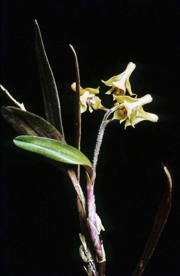 Found in western Cameroon in montane and submontane forests at elevations of 1600 to 2500 meters as a mini-miniature to small sized, cool to cold growing epiphyte with narrowly cylindrical pseudobulbs, new growths arising from the middle of the previous one, enveloped by basal sheaths and carrying 2 to 4, lanceoalte, linear-elliptic to linear-ligulate, acute, apically bilobed leaves that blooms in the spring and again in the fall on a terminal, erect, paniculate, 1 to 2" [2.5 to 5 cm] long, many flowered inflroescence with ovate-lanceolate to triangular-oblong, acute, sparsely glandular floral bracts. .