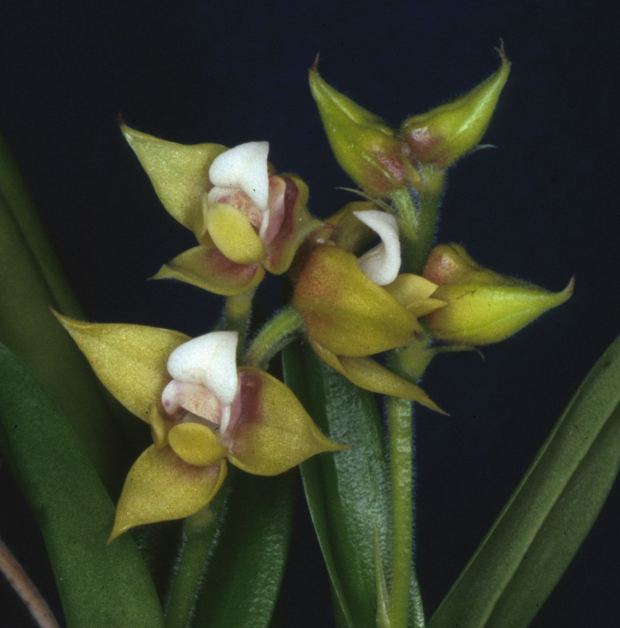Found only in southeastern Kenya in montane mist forests at elevations of 800 to 900 meters as a miniature sized, warm growing epiphyte with clustereed, conical pseudobulbs carrying 2 to 3, narrowly elliptic-lanceolate or oblanceolate, acute leaves that blooms in the spring on a terminal, erect, 3 to 4 flowered inflorescence with lanceolate, acuminate floral bracts with the pubescent flowers held close together at the apex of the inflorescence.