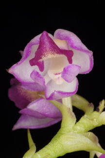 Found in central Madagascar on shaded humid rocks as a small sized, cool growing lithophyte with narrow pseudobulbs carrying 4 to 5, arched, linear, dark to purplish green leaves that blooms in the fall on an erect, terminal, peduncle covered by ancipitous sheaths, 3.2 to 4.8" [8 to 12 cm] long, rachis .8 to 1.6" [2 to 4 cm] long, subcorymbose, 10 to 20 flowered inflorescence with acute, thick, half as long as the ovary floral bracts and carrying large flowers.