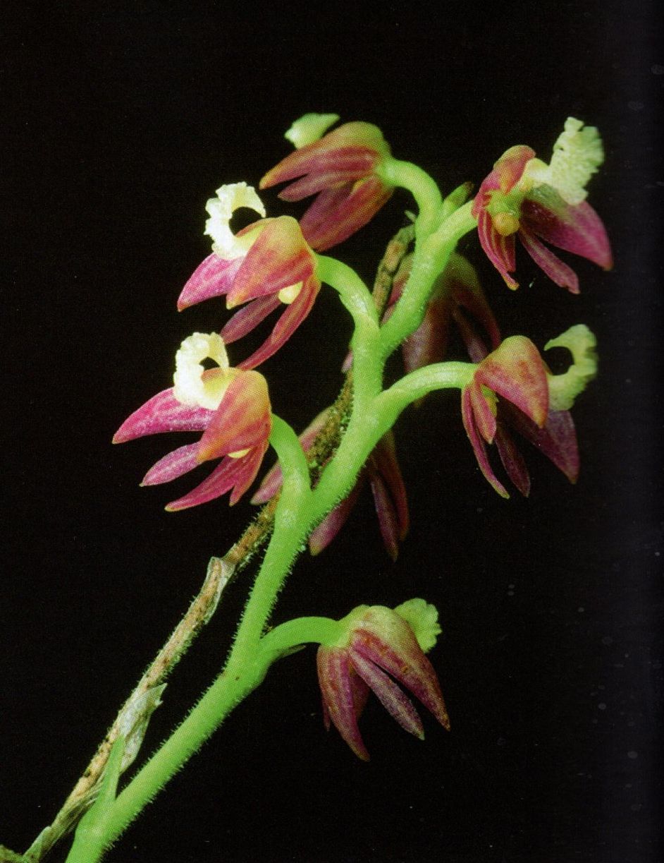 Found in central Madagascar in humid evergreen forests at elevations of 700 to 2000 meters as a small sized, warm to cool growing terrestrial with pseudobulbs enveloped by scarious, heavily striate sheaths and carrying 3 to 4, apical, lanceolate-linear, obtuse leaves embracing the base of the peduncle, that blooms in the summer and earlyfall 5" [12.5 cm] long, hirsute, 16 to 24 flowered inflorescence enveloped completely by 2 to 3, long, compressed, ancipitous, narrowly winged sheaths .