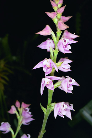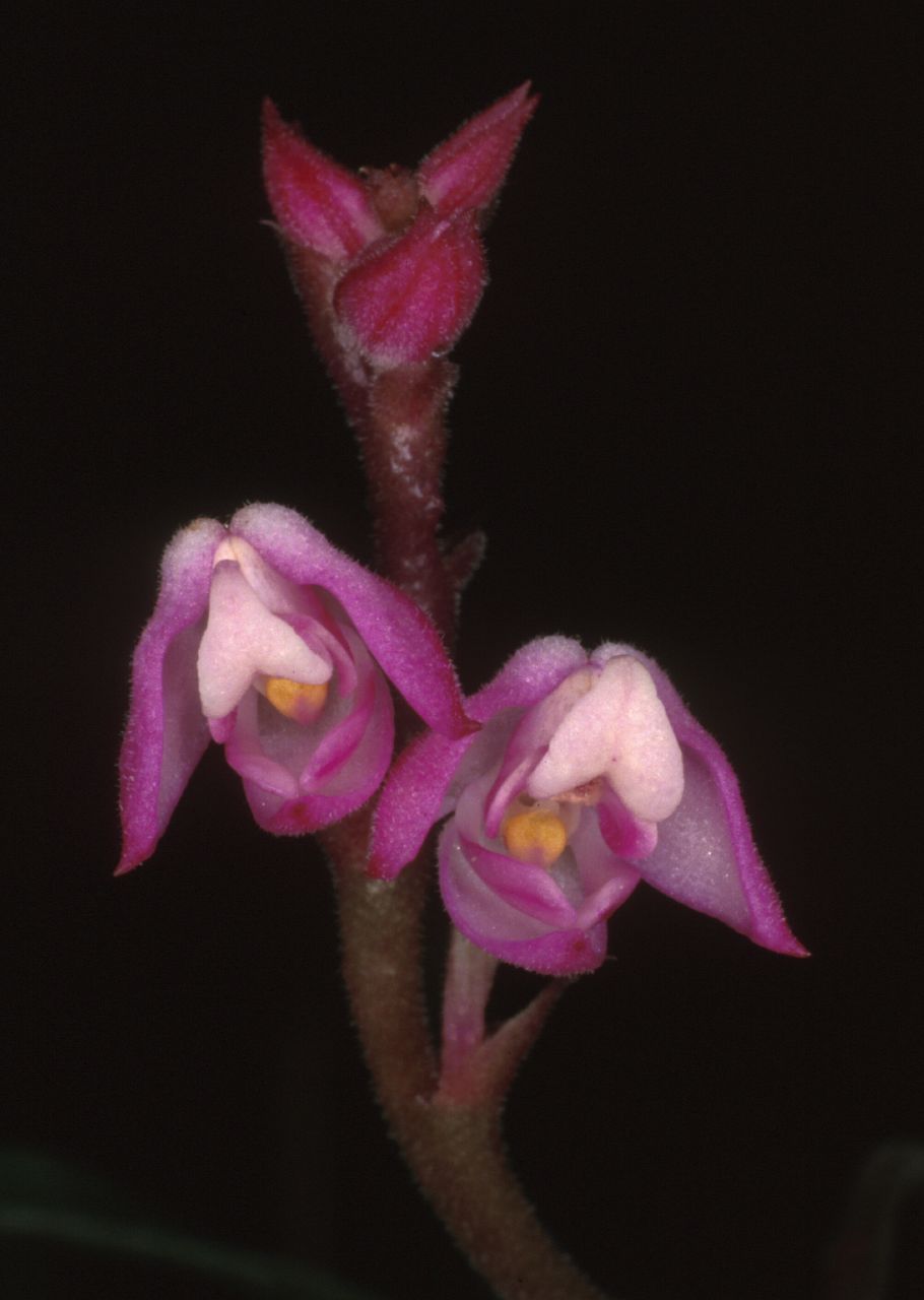 Found in eastern Zimbabwe on mountain slopes arising on granite and sandstone rocks at elevations of 1200 to 1800 meters as a small sized, cool growing lithophyte with conical to pear shaped, clustered, slightly ridged, single noded pseudobulbs carrying 4 to 5, narrowly elliptic, dark green leaves with a purple margin and blooms on a pubescent, 3 to 5" [7.5 to 12 cm] long, several to many [6 to 10] flowered inflorescence occuring in the summer with long-lasting, pubescent, flowers.