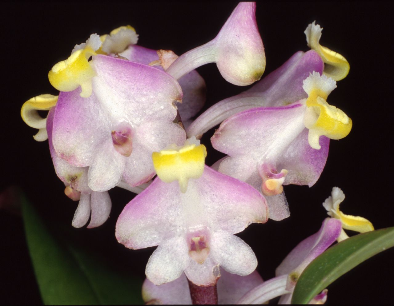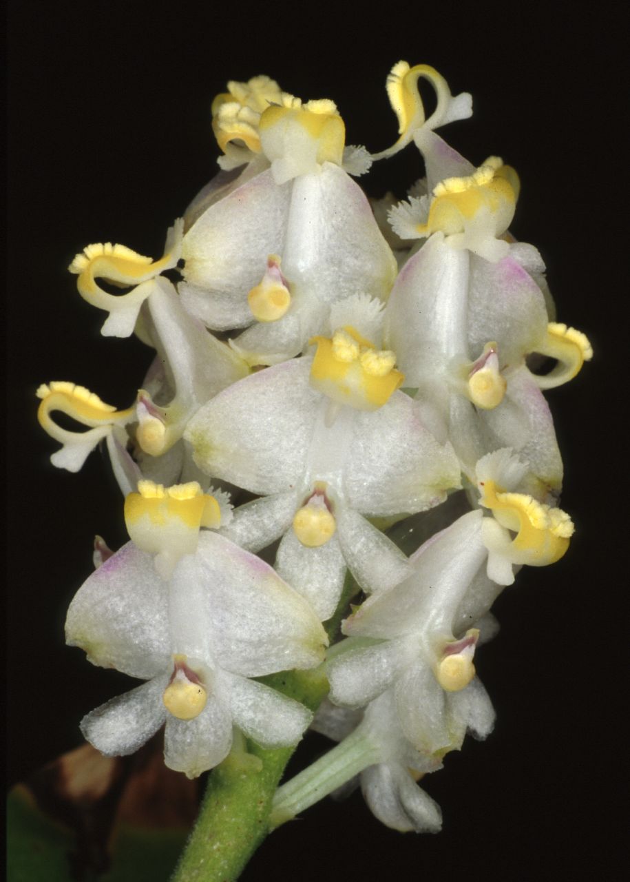 Found in Ivory Coast, Cameroon and Gabon in dry localities and mangrove swamps at elevations around 650 to 950 meters as a small sized, warm growing epiphyte with narrowly cylindrical-conical pseudsobnulbs enveloped by 5 to 6 leaf bases carrying oblong-lanceoalte, obtuse, unequally bilobed apcially, arising after flowering leaves that blooms in the late winter and early spring on an erect, peduncel, erect, stout, densely pubescent, to 8" [20 cm] long, rather densely to 35 flowered inflorescence with ovate, acute, thin, delicate, glabrous floral bracts.