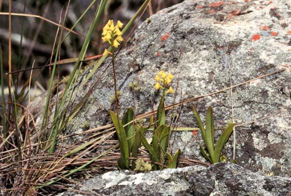 Found in Comoros and Madagascar in high elevation ericaceous scrub and humid forests at elevations of sea level to 1500 meters as a small sized, cool growing lithophytic orchid with fusiform pseudobulbs enveloped basally by 2 to 3 sheaths and carries 2 to 5, ligulate, longly attenuate toward the base and obtuse apically, rigid, coriaceous leaves that blooms in the winter on a terminal to 10" [to 25 cm] long, slightly pubescent, 6 to 12 flowered inflorescence.