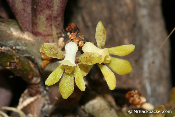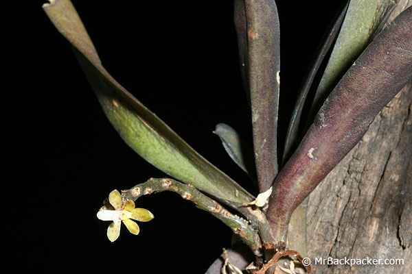 Found in Laos and Thailand at elevations of 300 to 500 meters as a miniature sized, hot growing epiphyte with short stems carrying 6, leathery leaves that blooms in the winter and spring on several descending, often basally single branched, to 4" [10 cm] long, successively to 7 at once, many flowered inflorescence.