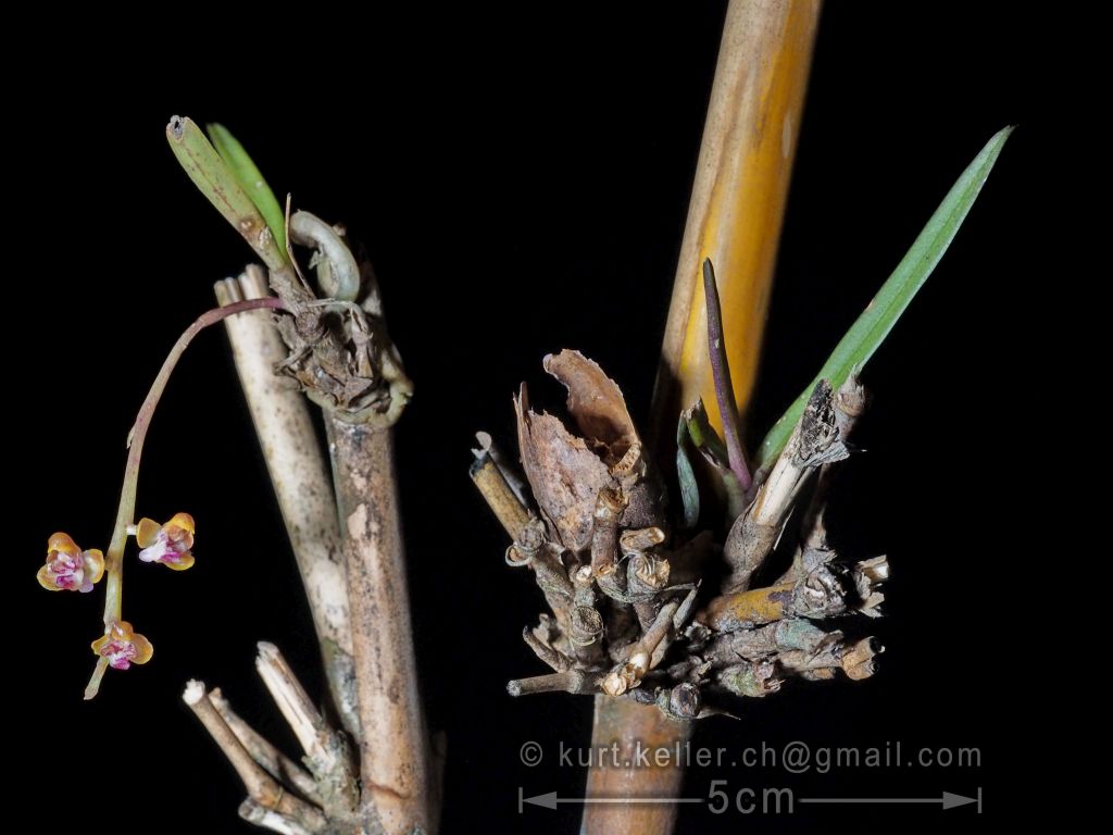 Found in the eastern Himalayas at elevations around 400 to 500 meters as a miniature sized, hot to warm growing epiphyte with none to a very short stem carrying fleshy, linear-oblong, acute, keeled, channeled, slightly narrowing towards the base leaves that blooms in the spring on a pendulous, peduncle with 3 to 4 bracts, 1.5 to 6.5” [3.75 to 15.2 cm] long, rachis thickened, to 12 flowered inflorescence with lanceolate floral bracts.