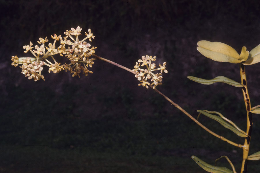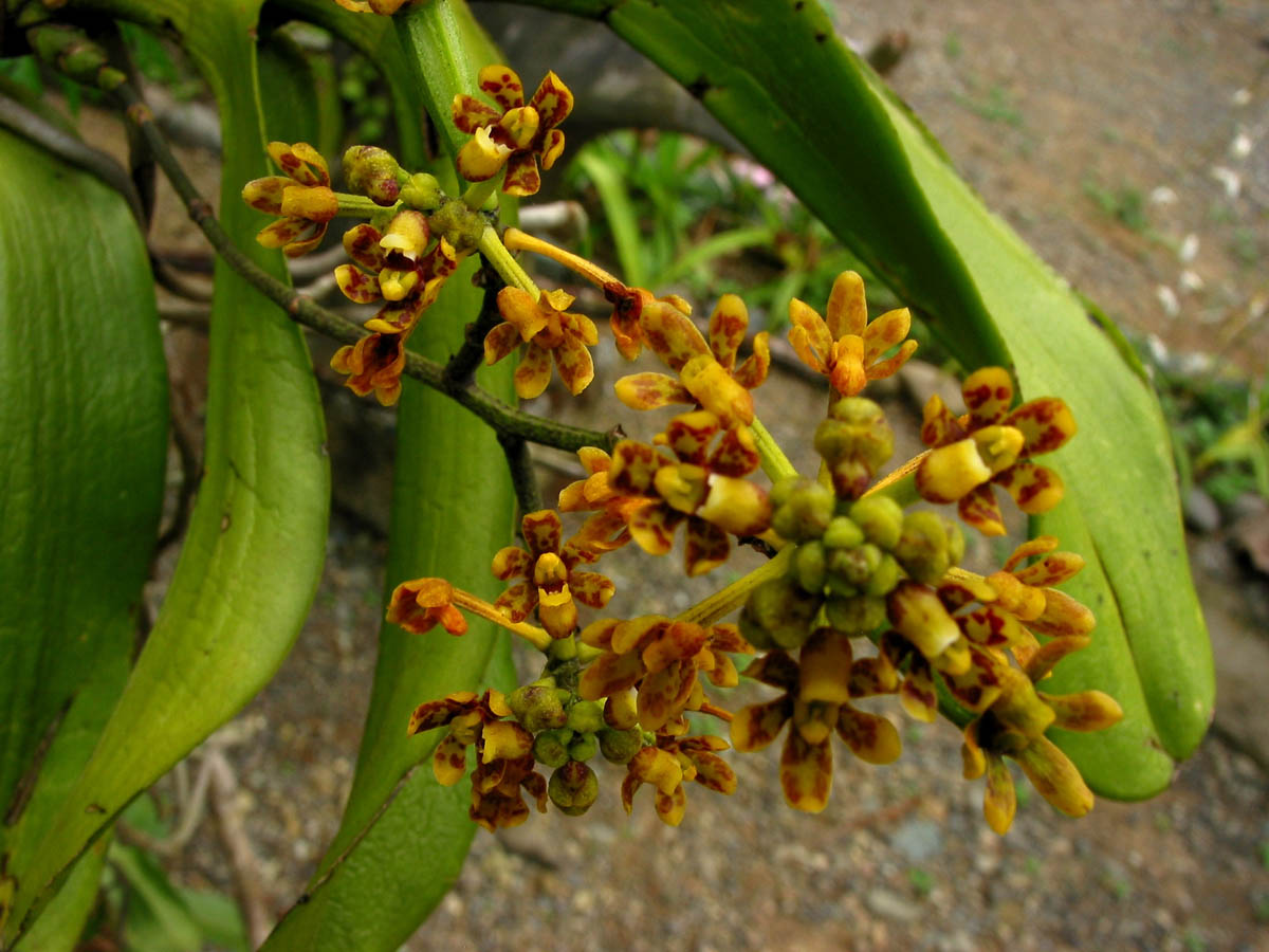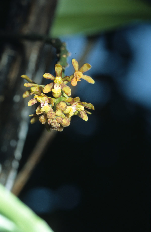Found in Malaysia, Sabah Borneo and the Philippines in lowland to lower montane forests on trees in open areas [at elevations around 1500 meters, only cited * tentative] as a giant sized, hot to [cool*] growing epiphyte with a stout stem carrying spreading, oblong, fleshy leaves that blooms on an erect,branched, peduncle terete, 5.6 to 8” [14 to 20 cm] long, 4 short, tubular bracted, branching some [2 to 5] in the upper part, incurved, 8” [20 cm] long overall, rachis dense, successively 4 to 5, many flowered inflorescence with very short, triangular floral bracts.