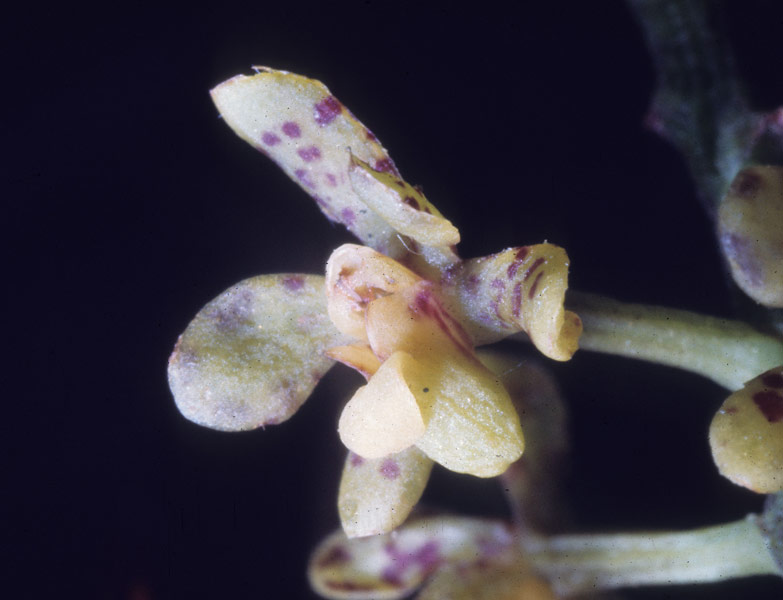 Seidenfaden states that the flowers are yellow-green to greenish and have dull purple spotting throughout the outside and only in the basal half on the inside.