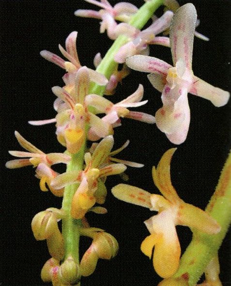 Found in the Moluccas on river and roadside trees and on the margins of montane forests at elevations of 600 to 1200 meters as a small sized, warm to cool growing epiphyte with a rather short, stout stem carrying up to 25 dull-grey green, erect leaves that are apically rounded and unequally bilobed and blooms in the summer on a several branched, erect, slender, finely pilose, 10 to 16" [25 to 40 cm] long, many flowered inflorescence with elongate triangular, acute floral bracts and carrying vanilla scented flowers.
