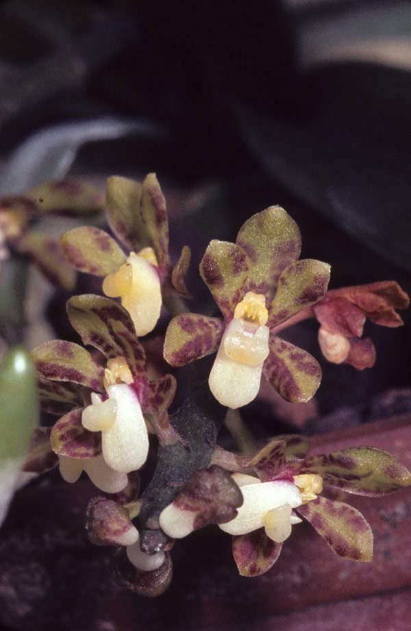 Found in penninsular Malaysia with a very short stem carrying a few leaves that blooms on a .4" [1 cm] long, few flowered inflorescence carrying red flowers.