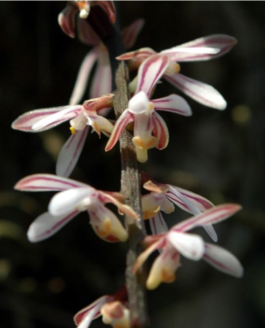 Found in Laos and Vietnam as a mini-miniature sized, cool growing epiphyte with a very short stem enveloped completely by imbricate leaf bases carrying strap-shaped, unequally bilobed apically, condupliate below into the base leaves that blooms on an axillary, 4 to 4.8" [10 to 12 cm] long, laxly several flowered inflorescence.