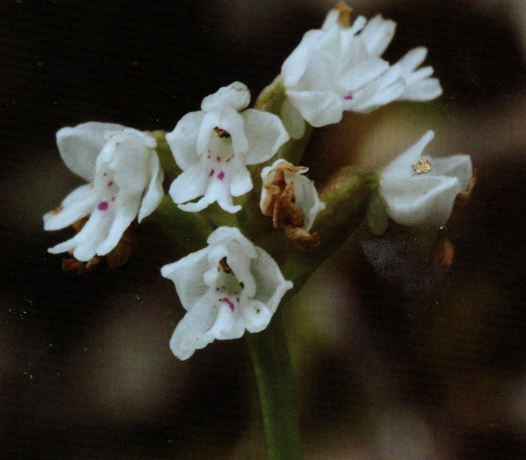 Found in Sichuan and western Hubei provinces of China in rocky soils amd damp places in forsts at elevations of 2600 to 3600 meters as a mini-miniature to miniature sized, cold growing terrestrial with an ellipsoid tuber giving rise to a stem with 1 to 2, basal tubular sheaths and carrying a single, cauline, porrect, linear-lanceolate, acute leaves that blooms on an erect, peduncle ebracteate, or with 1 occasionally foliaceous bract, rachis .4 to 1.4" [1 to 3.5 cm] long, laxly to subdensely 3 to more than 10 flowered inflorescence with lanceolate, usually shorter than the ovary, acute floral bracts and carrying secund flowers