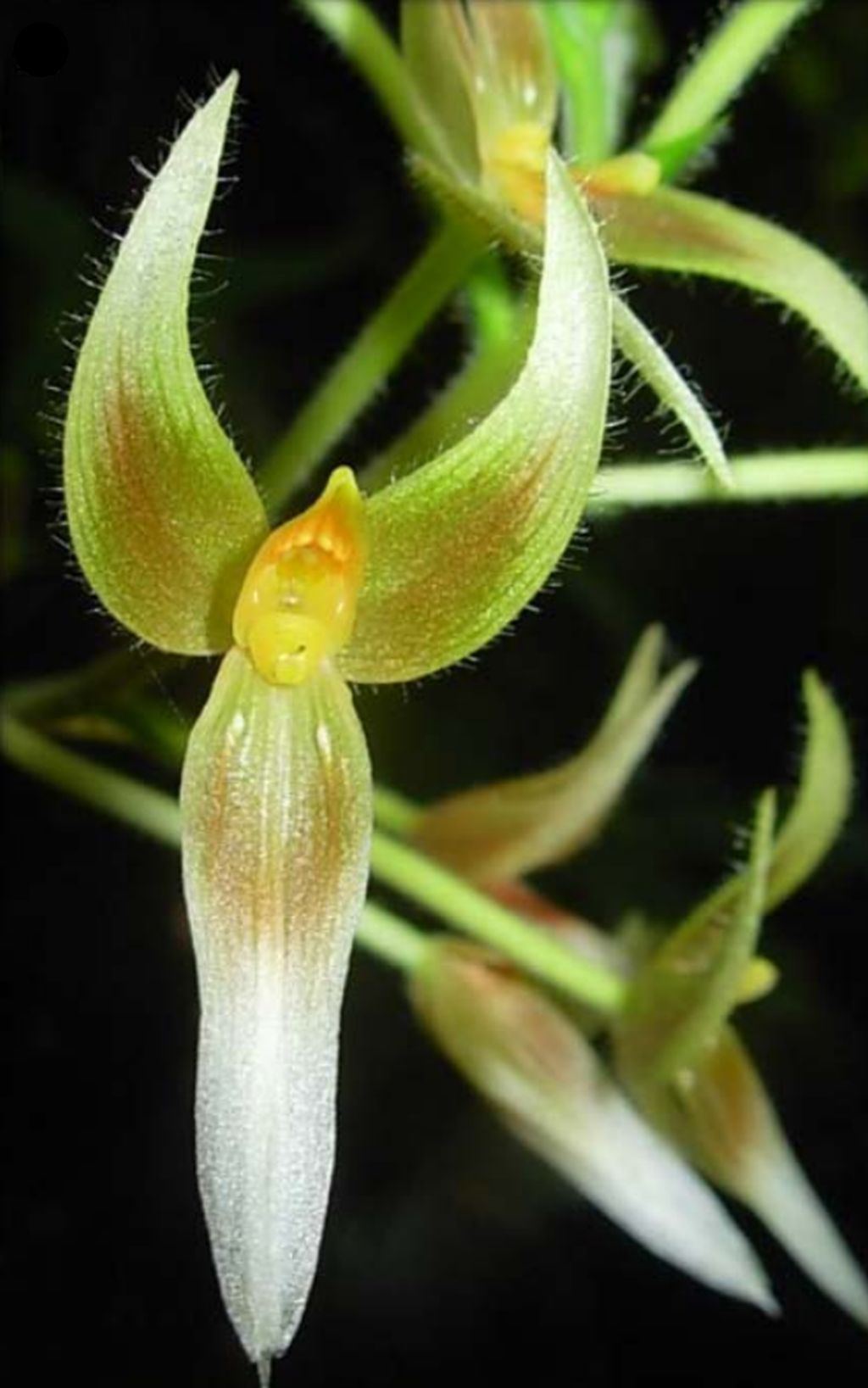 Found in Pasco department of Peru in constantly foggy, premontane forest at elevations around 1400 meters as a medium sized, cool growing terrestrial with spathulate-elliptic, flexuous, covered by clavate, glandular hairs, conduplicate below into the base leaves that blooms on a terminal, erect, provided with 3, short bracts, 19.6" [48 cm] long, successively 5 to 7, many flowered inflorescence with hairy, half as long as the ovary floral bracts.