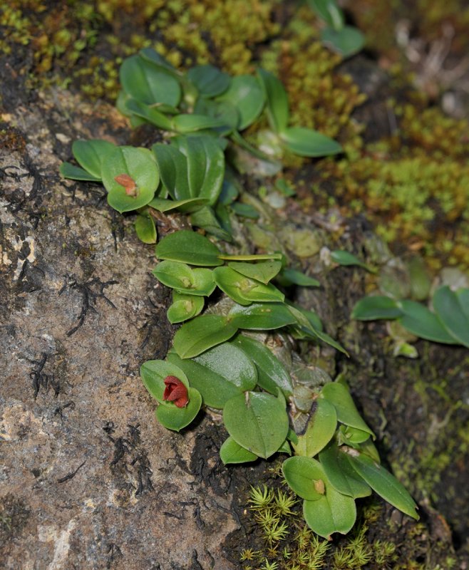 Found in northern Borneo low primary hill forests in ultramafic habitats often at the base of Gymnostoma sumatrana trees or adpressed to rocks at elevations of 600 to 1000 meters as a mini-miniature sized, hot to warm growing epipiphyte or lithophyte with a creeping rhizome giving rise to flattened, ovoid, often bilobed pseudobulb enveloped in youth by a sheath and carrying 1 to 2, oblong to oblongovate, minutely retuse to asymetric apically, glabrous leaves that blooms in the summer on a short, proteranthous, basal, .16" [4 mm] long, single flowered inflorescence.