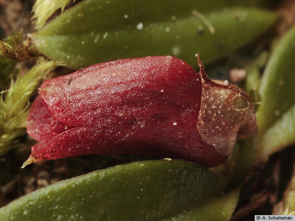 Found in Assam, Bhutan, Thailand, Malaysia, Laos and Vietnam on open vertical cliffs at elevations of 700 to 1600 meters as a miniature sized, warm to cool growing epiphyte or lithophyte with densely clustered, flattened, globose-turbinate to discoid-lenticular, Hershey-kiss-like, green with brown veins pseudobulbs enveloped basally by a fibrous membrane carrying, 2, apical, elliptic oblong, mucronate, grooved, shortly petiolate leaves that appear after flowering and blooms in the early summer on a terminal, short to 2" [2.5 to 5 cm], one flowered inflorescence that arises from the apex of the pseudobulb.