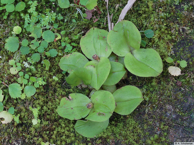 Found in northeastern India, Sikkim, Thailand and Laos at elevations of 300 to 500 meters as a mini-miniature sized, hot growing epiphyte with densely clustered, depressed-lenticular pseudobulbs enveloped by a membrane that forms a reticulate cage-like structure and carrying 2, apical, erect, oblanceolate to elliptic, subacute, weakly reticulate, many veined, sessile, minutely ciliolate margined leaves that blooms in the fall on a short, axillary, 2 flowered inflorescence.