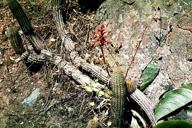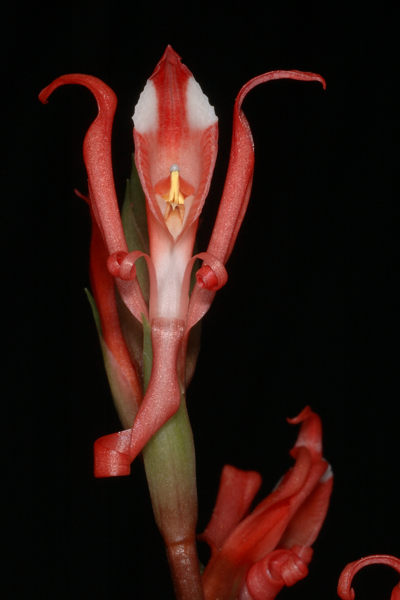 This litho-terrestrial is found in Ecuador and Peru in dry montane regions with scattered trees at elevations of 1100 to 2800 meters. This orchid has fasciculate, stout, tuberous roots with oblong-lanceolate to oblanceolate, acute leaves that narrow to the basal sheathing base and are withered or absent by blooming time in the spring and summer when a stout, slender, glabrous stem enveloped by tubular-cylindric, scarious sheaths with a free, triangular, acuminate apex stem arises with a showy, thick-cylindric, several to many flowered, to 5 1/2" [to 14 cm] long, subdense or dense inflorescence with cucullate-ovate, acuminate floral bracts that exceed the length of the glabrous ovary and carries relatively large, showy, glabrous, non-resupinate flowers.