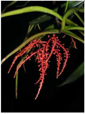 Found in Borneo and Papua New Guinea in hill forests at elevations around 1000 meters as a small sized, warm to cool growing epiphtye that blooms in the winter and early spring on 1 4 to 6" [10 to 15 cm] long, branched, red, several flowered inflorescence.