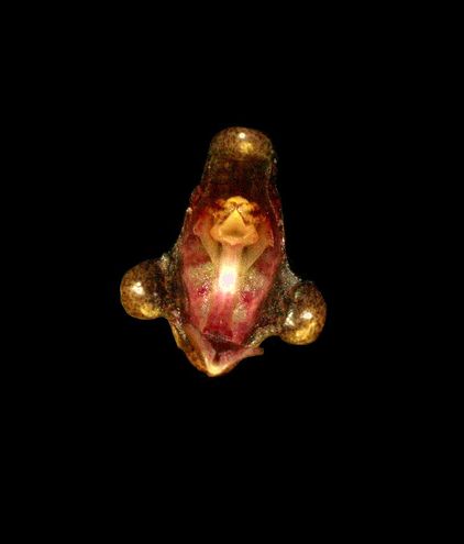 Found in Ecuador at elevations around 1000 to 1400 meters as a mini-miniature sized, warm to cool growing epiphyte with blackish, erect, slender ramicauls enveloped by 2 to 3 tubular sheaths and carrying an erect, coriaceous, narrowly obovate, subacute, gradually narrowing below into the slender, elongate petiolate base leaf that blooms in the summer on a suberect to horizontal, slender, glabrous, 2.4 to 3.2" [6 to 8 cm] long, congested, successively few flowered inflorescence arising from low on the ramicaul with a few distant bracts and tubular imbricating floral bracts.