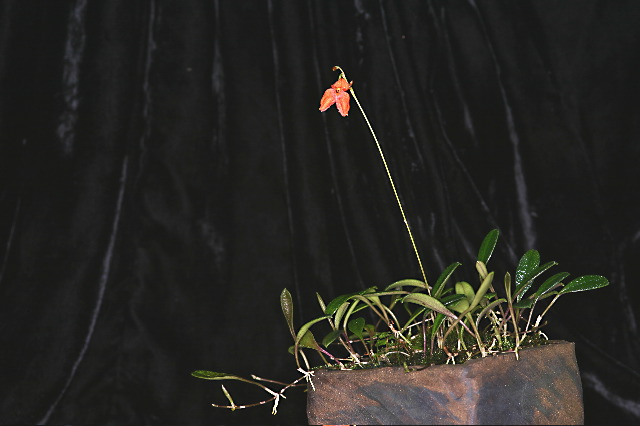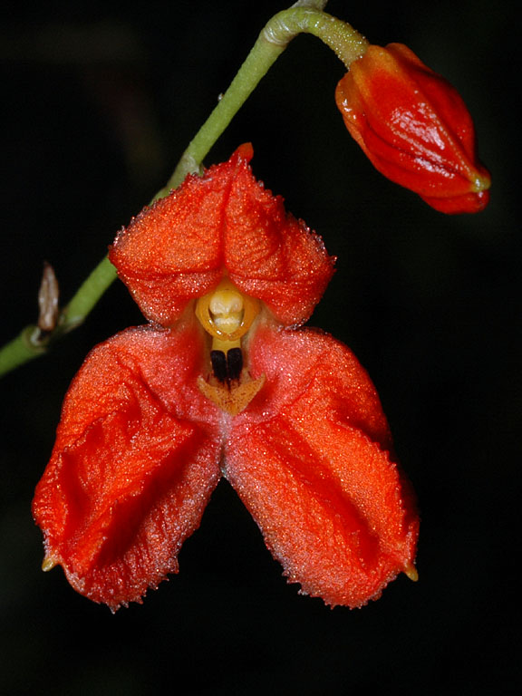 Found in Colombia and Ecuador at elevations of 1900 to 2900 meters as a mini-miniature sized, cool to cold growing terrestrial or epiphyte with erect, slender ramicauls enveloped basally by 2 to 3 tubular sheaths carrying a single, apical, erect, coriaceous, elliptical, obtuse leaf with the base cuneate into the slender, elongate petiole that blooms in the fall on an erect, slender loose, successively few flowered, 6 to 8 1/5" [15 to 21 cm] long, racemose inflorescence with a few distant, tubular floral bracts and 2 to 3 flowers open simultaneously.