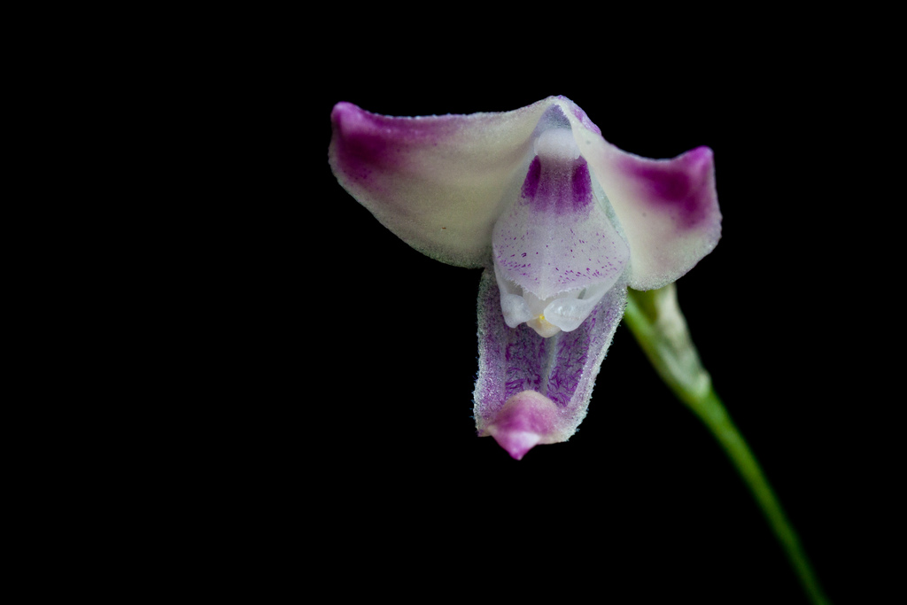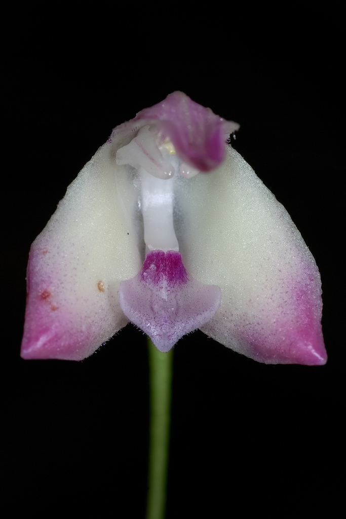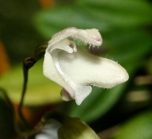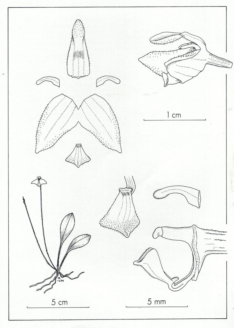 Found in Ecuador at elevations of 1200 meters in cloud forests as a mini-miniature sized, cool growing epiphtye with blackish, erect, slender ramicauls enveloped basally by 2 to 3 tubular sheaths and carrying a single, apical, erct, coriaceous, elliptical, obtuse to subacute leaf thqat is cuneate into the slender, blackish, elongate petiole that blooms in the spring on a slender, erect, successively single flowered inflorescence arising from low on the ramicaul and with 2 closely applied, distant bracts and tubular, imbricating floral bracts carrying resupinate flowers.