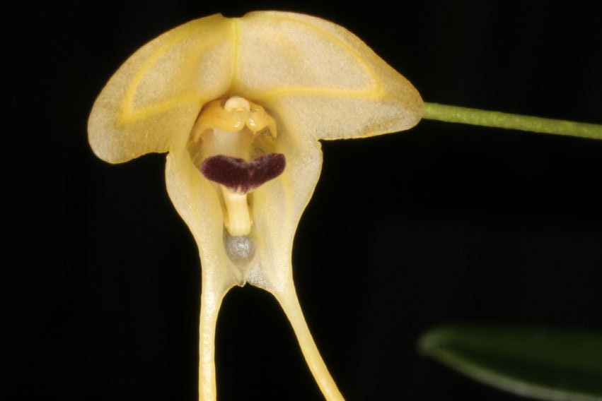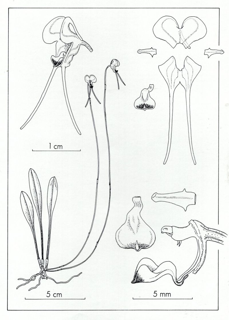 Found in Carchi province of Ecuador in cloud forests at elevations around 1920 meters as a mini-miniature sized, cool to cold growing epiphyte or terrestrial with blackish, erect, slender ramicauls enveloped baslly by 2 to 3 tubular sheaths and carrying a single, apical, erect, coriaceous, narrolwy obovate, subacute, gradually narrowing below into the elongate, slender, petiolate base leaf the blooms in the spring on a very slender, erect to suberect, glabrous, 4.4 to 8" [11 to 20 cm] long, congested, successively few flowered inflorescence arising from low on the ramicaul with tubular, imbricating floral bracts.