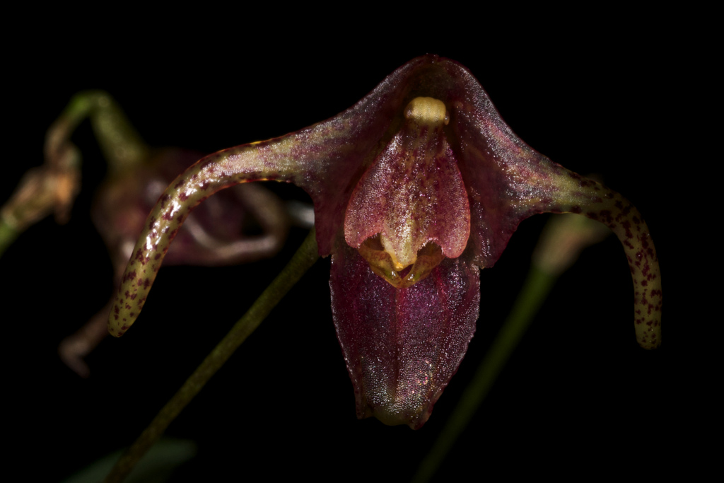 Found in Morona-Santiago province of Ecuador in cloud forests at elevations of 1550 meters as a mini-miniature sized, cool growing epiphyte with blackish, slender, erect ramicauls enveloped basally by 2 to 3 thin, tubular sheaths and carrying a single, apcial, erect to suberect, thickly coriaceous, finely verrucose, elliptical-obovate, obtuse, cuneate below into the slender, petiolate base leaf that blooms in the winter on a slender, erect, smooth, congested, racemose, 2.8" to 3.4" [7 to 8.5 cm] long, successively single, few flowered inflorescence arising from low on the ramicaul with three closely applied, distant bracts and imbricating, tubular floral bracts.
