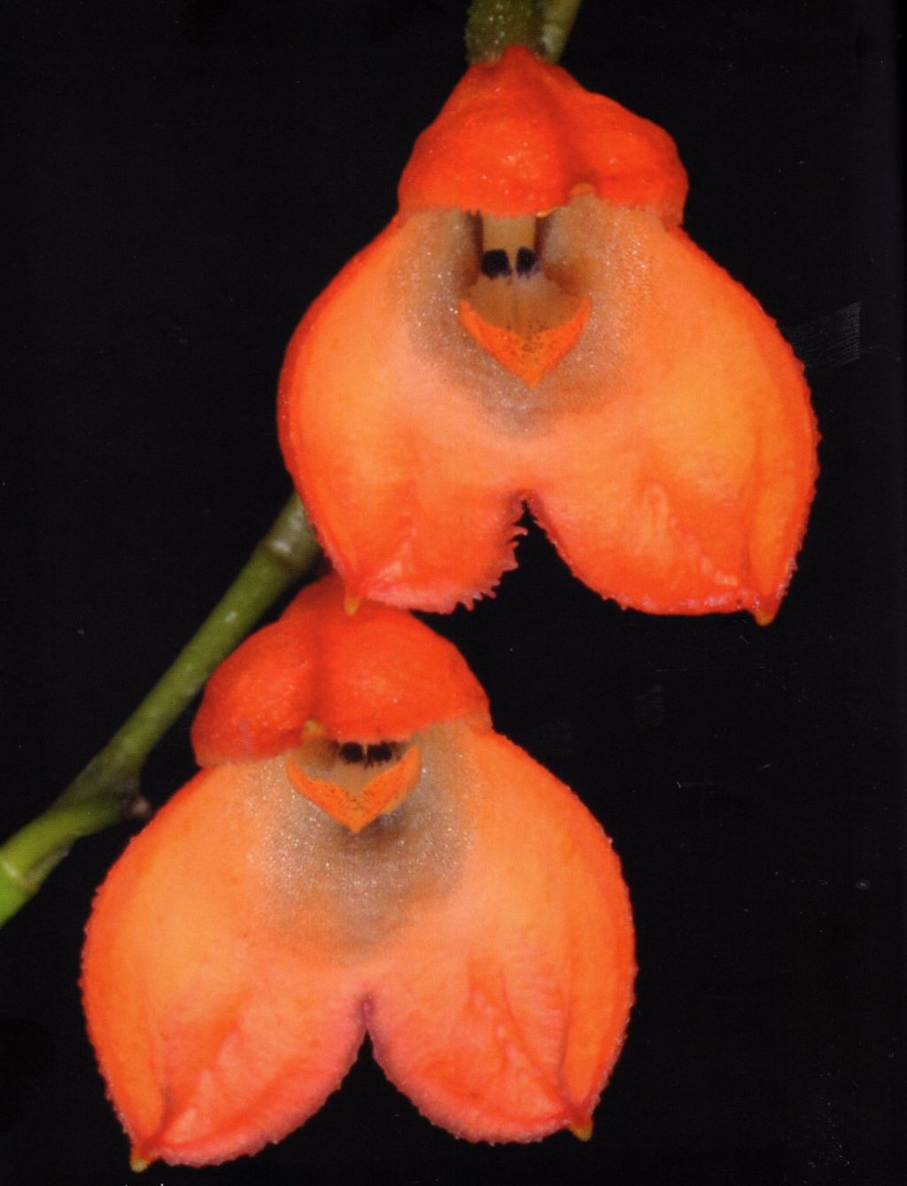 Found in Imbabura province of Ecuador at elevations around 2445 meters as a mini-miniature sized, cold growing, long-repent epiphyte with erect, slender ramicauls enveloped by 2 tubular sheaths and carrying a single, apical, erect, coriaceous, elliptical, obtuse, cuneate below into the slender petiolate base leaf that blooms in the late summer and early fall on a distant, 5" [12.5 cm] long, successively single, few flowered inflorescence arising from the base of the ramicaul with a few short bracts and has a tubular floral bract.