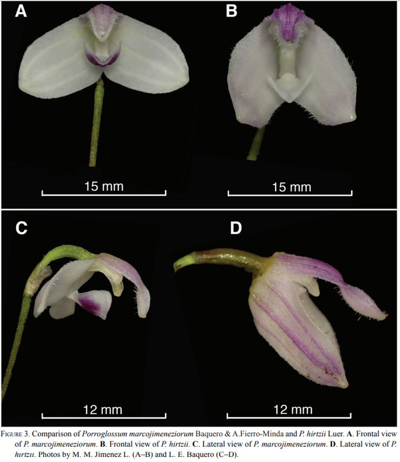 ”Porroglossum marcojimeneziorum is similar to P. hirtzii from which it differs by possessing smaller flowers .64" to .72” VS .8” (16–18 mm vs. 20 mm of the corolla), with widely opened lateral sepals (vs. a larger flower with the lateral sepals inflexed forward), triangular ovate, obtuse, and white with cream colored nerves in the adaxial side (vs. triangular ovate, subacute, and white suffused with pale rose in the adaxial side), the callus of the lip transversely triangular and longitudinally notched in the middle (vs. the low, erect, transverse, entire callus), the blade of the lip transversely obovate stained with purple (vs. rhomboid and white)" Baquero & A.Fierro-Minda 2020