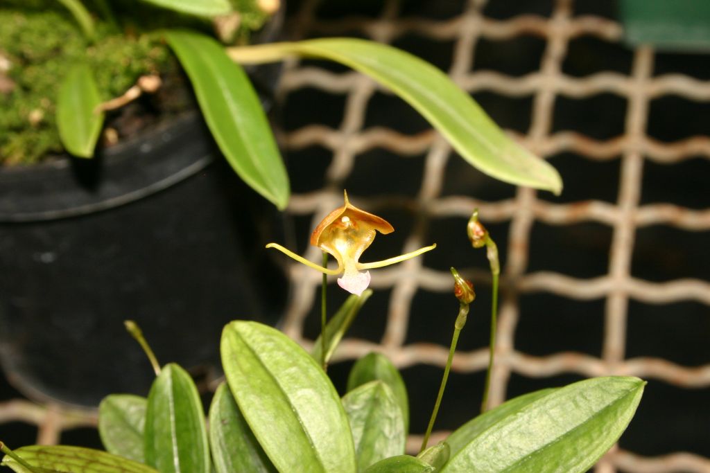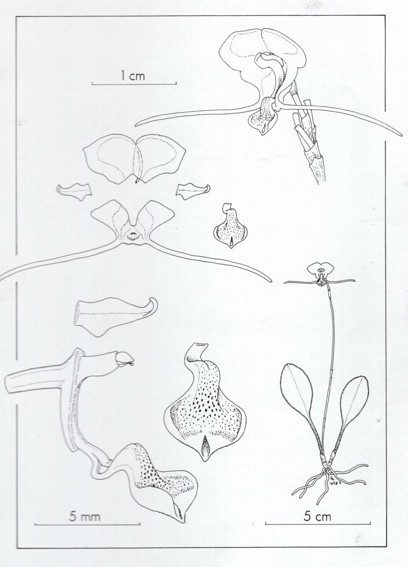 Found in Putumayo department of Colombia on the eastern slopes at elevations around 2000 meters as a mini-miniature sized, cool to cold growing epiphyte with erect, slender ramicauls enveloped by 2 to 3 tubular sheaths and carrying a single, apical, erect, coriaceous, ellipical, obtuse, narrowing below into the cuneate base leaf that blooms in the spring on a congested, erect, smooth, slender, 1.6 to 3" [4 to 7.5 cm] long, successively few flowered, racemose inflorescnece arising from low on the ramicaul with 2 to 3, closely applied, distant bracts and imbricating floral bracts.