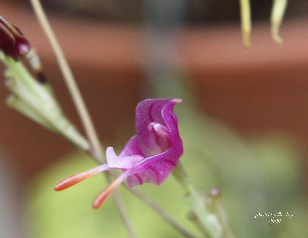 The small bright pink flowers are produced in succession for quite a number of months on a thin, 3.6 to 4" [9 to 10 cm] long, wiry inflorescence that carries a single flower held well above the net veined, dark green leaves, stippled with purple on the back. It grows best in cool climates.