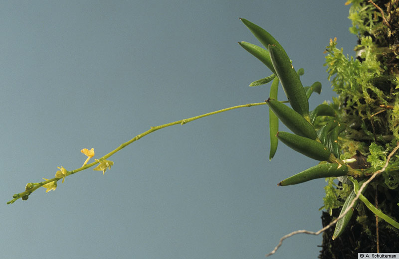 Found in Northern Borneo, Western Java and Sulawesi in lower montane, mossy or scrub forests on sandstone ridges at elevations around 1100 to 1700 meters as a miniature sized, warm to cool growing, monopodial epiphyte on small branches of shrubs and trees with a short stem carrying to 6, lanceolate, v-channelled, thick, fleshy, acute, basally clasping leaves that blooms in the spring and early summer as well as fall on several at once to 2" [5 cm] long, few flowered inflorescence and holding the flowers in the apical third.