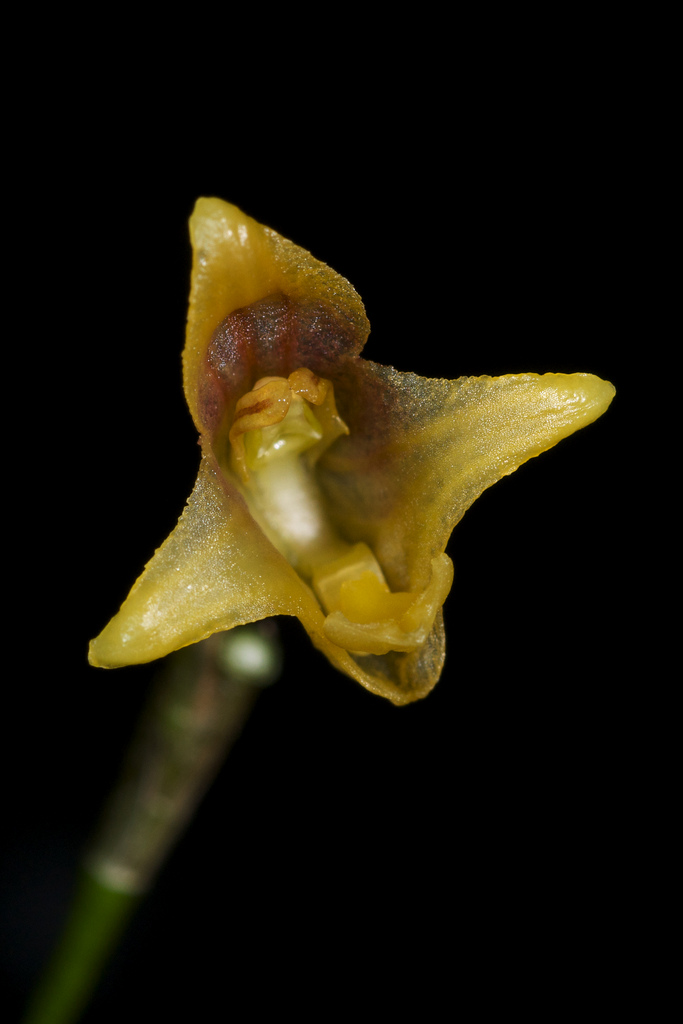 Found in Zamora-Chinchipe province of Ecuador at elevatins around 2500 meters as a mini-miniature sized, cold growing epiphyte with erect, ramicauls enveloped by 2 to 3 tubualr sheaths and carrying a single, apical, erect, coriaceous, faintly rugose, elliptical, subacute, cuneate below into the petiolate base leaf that blooms in the late winter on a slender, [8 to 9.5 cm] long, successively few flowered, racemose inflorescence arising from low on the ramiucal with a bract below the middle and imbricating, tubular floral bracts.