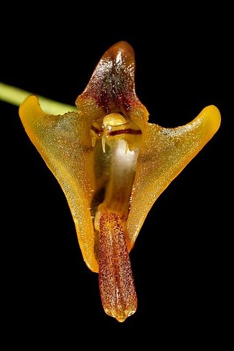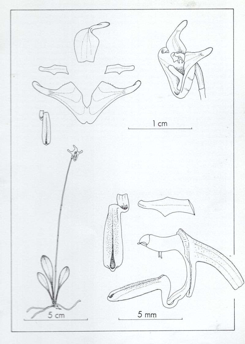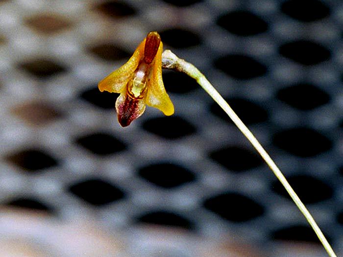 Found in southrn Ecuador at elevations of 1500 to 1700 meters as a mini-miniature, cool growing epiphyte with blackish, slender, erect, ramicauls enveloped basally by 2 to 3 tubular sheaths carrying a single, erect, coriaceous, elliptical-obovate, obtuse with the base cuneate into the slender petiolate base leaf and flowers in the spring on a congested, successively few flowered, smooth, slender, 3.6 to 6" [9 to 15 cm] long, racemose inflorescence arising from low on the ramicaul with 2 to 3, distant, tubular bracts at intervals all along and imbricating floral bracts holding the resupinate flower with a semiterete blade of the lip