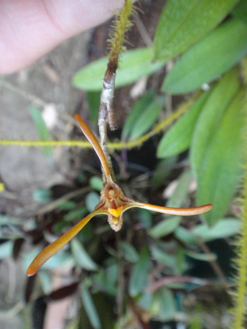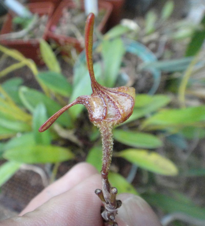 Found in Colombia without collection data as a mini-miniature sized, cool growing epiphyte with erect, stour ramicauls enveloped by a tubular sheaths and another at the base and carrying a single, erect, thickly coriaceous, ellitpoical, obtuse, narrowing below into the petiolate base leaf that blooms in the spring on an erect, densely pubescent, to 4.8" [12 cm] long, congested, successively single, racemose inflorescencearising from low on the ramicaul and has imbricating, tubular floral bracts,