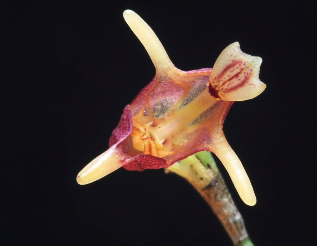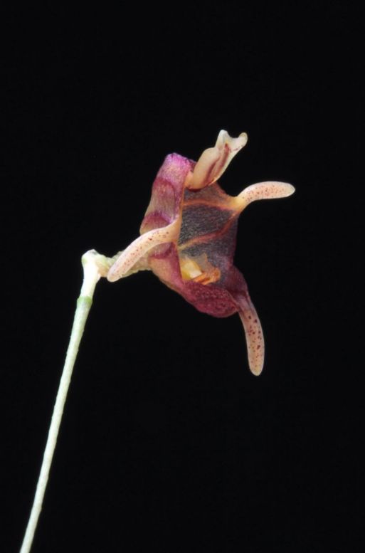 Found in Morona Santiago province of Ecuador in cloud forests at elevations around 1600 meters as a mini-miiature sized, cool growing, caespitose epiphyte with erect ramicauls enveloped by 1 to 2, thin, tubular sheaths and carrying a single, apical, erect, coriaceous, slightly verrucose, elliptical, acute,contracted below int the petiolate base leaf that blooms in the late summer and early fall on an erect, from low on the ramicaul slender, glabrous peduncle, 3.4 to 4" [8 to 10 cm] long, with a tubular bract near the middle, successively single flowered inflorescence followed by another .08" [2 mm] apart with shorter than the pedicel floral bracts and carryng flowers with fleshy, glabrous sepals pale purple with white tails, transluscent petals and a white rose veined lip.