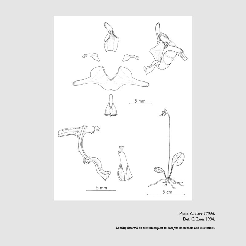 Found in Peru at elevations around 2000 meters as a mini-miniature sized, cool to cold growing epiphyte with blackish, erect, slender ramicauls enveloped by 2 to 3 tubular sheaths and carrying a single, apical, erect to suberect, rigidly coriaceous, subverrucose, ellitpical, obtuse to rounded cuneate below into the petiolate base leaf that blooms in the winter on a erect, smooth, slender, 3.2" [8 cm] long, successively few flowered inflorescence arsing from low on the ramicaul with 3, close, distant bracts and tubular, imbricating floral bracts.